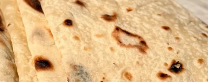 - Podzielić ciasto na 8 równych kawałków o wadze około 100 g każdy, cienko rozwałkować i smażyć na odwróconej rozgrzanej blasze do pieczenia z obu stron, jak pokazano na filmie.